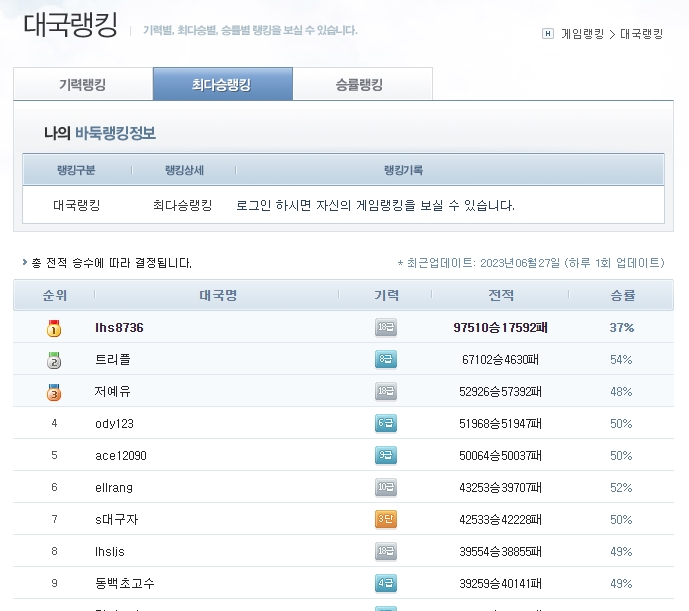 7. 최다 승리 기록을 보니 무려 10만 판 이상의 대국을 치른 플레이어도 있습니다. 이는 수년간 꾸준히 게임을 즐긴 결과이며, 게임 커뮤니티에서 이런 기록을 보는 것만으로도 흥미롭습니다. 도전 의욕을 자극하는 요소이기도 합니다.