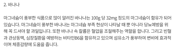 4. 바나나는 100g당 약 32mg의 마그네슘을 포함하고 있어 마그네슘 부족으로 인한 눈 떨림 현상을 예방하는 데 효과적입니다. 바나나 속 칼륨은 혈압 조절에 도움을 주며, 비타민 B6는 신경 안정 효과가 있어 스트레스 해소와 심혈관 질환 예방에도 유용합니다. 바나나는 섬유소도 풍부해 변비 예방과 체중 감량에 도움을 주는 다용도의 건강 식품입니다.