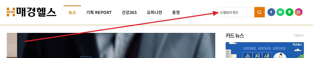 2. 홈페이지 우측 상단의 검색창에 눈떨림에 좋은 키워드를 입력합니다. 검색 결과에서 마그네슘이 풍부한 음식에 대한 기사를 클릭하면, 눈 떨림 증상을 완화하거나 예방하는 데 효과적인 다양한 음식에 대한 정보를 확인할 수 있습니다.