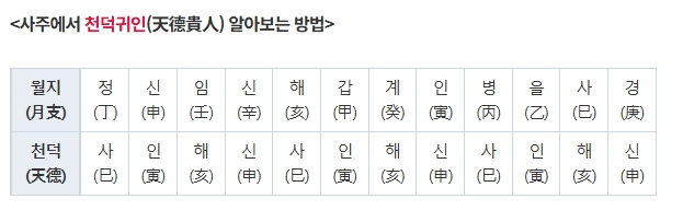 4. 사주 내 천덕귀인을 판별하는 방법을 확인합니다. 월지(月支)를 기준으로 하여 특정 조합(예: 사, 인, 해)과 일치하는 경우 천덕귀인이 있다고 판단합니다. 표를 통해 자신이 천덕귀인에 해당하는지를 쉽게 확인할 수 있습니다.