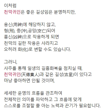 결론적으로 천덕귀인은 사주에서 큰 복과 안정된 삶을 상징하는 중요한 길성으로, 하늘로부터 주어진 덕과 보호를 나타냅니다. 이는 삶의 여러 국면에서 긍정적인 영향을 미치며, 어려운 상황을 극복하거나 예상치 못한 도움을 받을 수 있는 기회를 제공합니다. 이와 같은 길성은 단순히 운명적인 요소로만 해석되지 않고, 개인의 삶과 환경에서 어떻게 발현되는지에 따라 그 의미와 영향이 더욱 풍부해질 수 있습니다.