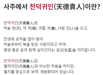 2. 홈페이지에서 검색창에 천덕귀인을 입력한 후 관련 내용을 찾아 클릭합니다. 해당 페이지에서는 천덕귀인의 정의와 사주에서 이를 확인하는 방법, 그리고 이를 통한 길흉 판단 등에 대한 정보를 제공합니다.