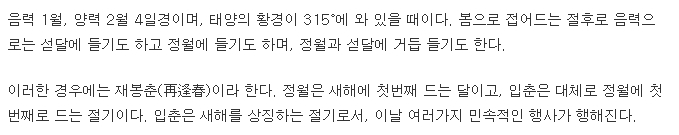 2. 2025년 입춘은 양력 2월 3일입니다. 입춘은 24절기 중 첫 번째 절기로, 봄의 시작을 알리는 의미 있는 날입니다. 이 날은 태양의 황경이 315°에 도달하는 시점으로 계산되며, 농경 사회에서는 농사의 시작을 알리는 신호로도 중요하게 여겨졌습니다. 이는 사람들에게 봄이 왔음을 알리는 동시에 새해의 풍년을 기원하는 전통적인 날이기도 합니다.