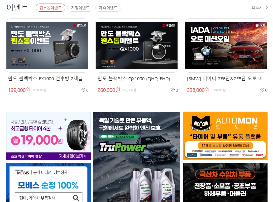 2. 홈페이지 상단 메뉴에서 이벤트 섹션을 클릭합니다. 현재 진행 중인 다양한 프로모션 및 할인을 확인할 수 있는 페이지로, 예를 들어, 블랙박스 원스톱 이벤트, BMW 미션오일 프로모션 등 차량 유지보수를 위한 제품과 서비스 할인이 제공됩니다. 이 섹션은 자동차 소유자들에게 경제적 혜택을 제공하며, 서비스 이용 전 반드시 확인해야 할 페이지입니다.