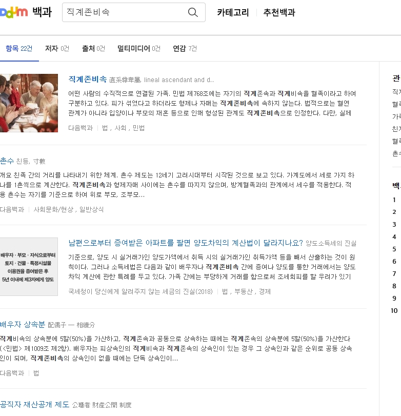 2. 검색창에 직계존비속을 입력한 뒤 나온 검색 결과 중 가장 상단에 있는 항목을 클릭합니다. 직계존비속은 법적, 행정적 용어로 가족관계를 설명할 때 중요한 개념입니다. 검색 결과에서는 직계존속과 직계비속의 정의와 범위, 촌수에 대한 정보가 제공됩니다. 다른 관련 용어도 함께 확인하면 전체적인 맥락을 이해하기에 좋습니다.