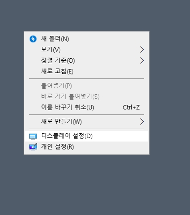 1. 바탕화면의 빈 공간에 마우스를 가져다 놓고 우클릭을 합니다. 나타난 메뉴에서 디스플레이 설정을 클릭합니다. 디스플레이 설정은 모니터의 밝기, 해상도, 배율 등을 조정할 수 있는 메뉴로, 화면 관련 대부분의 설정을 관리할 수 있습니다.
