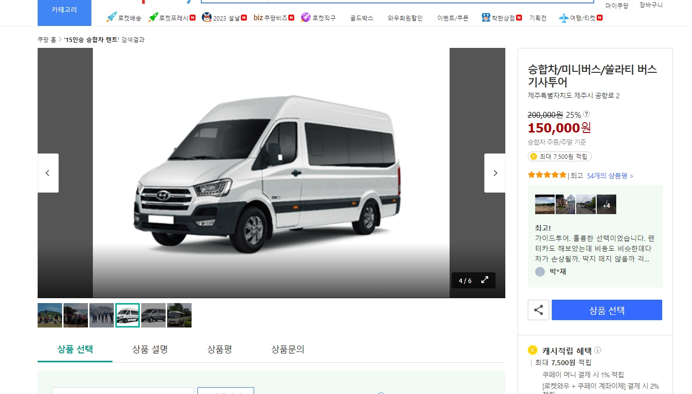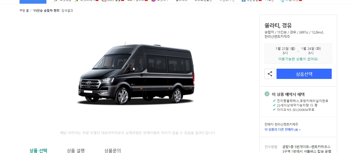 7. 이번에는 쿠팡에 접속하여 15인승 승합차 렌트를 검색합니다. 쿠팡에서는 다른 업체와 비교할 수 있는 옵션을 제공합니다.