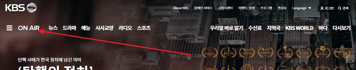 2. 홈페이지 좌측 상단에 있는 온에어 메뉴 버튼을 클릭합니다. 이를 통해 현재 방송 중인 실시간 프로그램을 시청할 수 있는 페이지로 이동합니다.