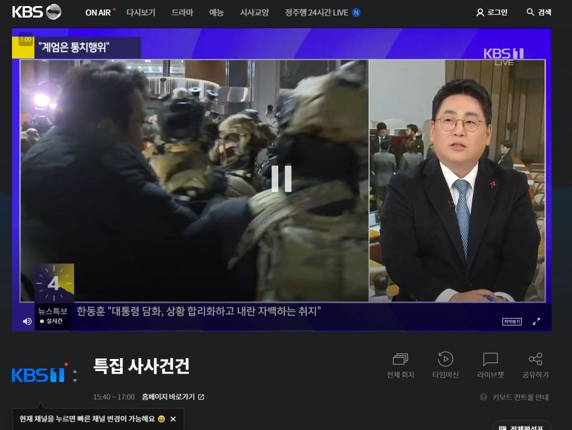 3. KBS1 채널을 선택하고, 현재 실시간으로 방송되고 있는 프로그램을 확인합니다. 예를 들어, 특집 사사건건 방송이 진행 중이라면 해당 화면이 표시됩니다.