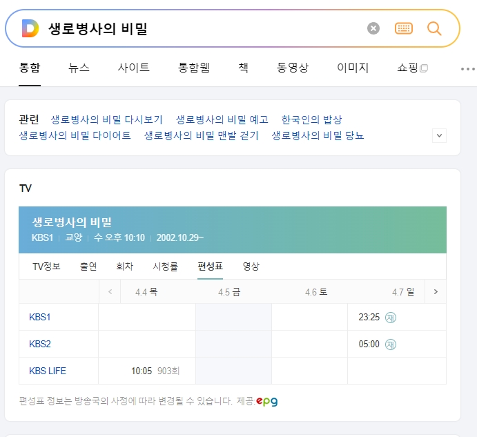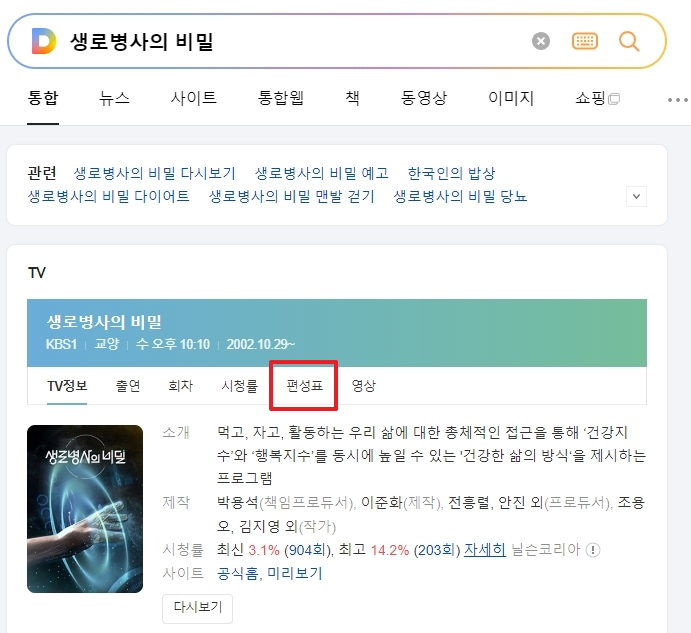 재방송 정보를 찾기 위해서는 다시 검색엔진을 이용하여 생로병사의 비밀을 검색하고 편성표를 확인할 수 있습니다.