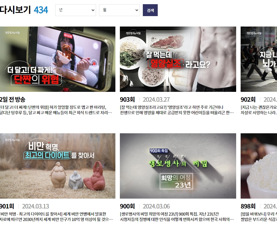 KBS 공식 홈페이지에 접속하면, 다양한 회차의 영상들을 만나볼 수 있습니다. 현재까지 총 434개의 영상이 업로드 되어 있으니 원하는 회차를 선택하여 시청할 수 있겠네요.