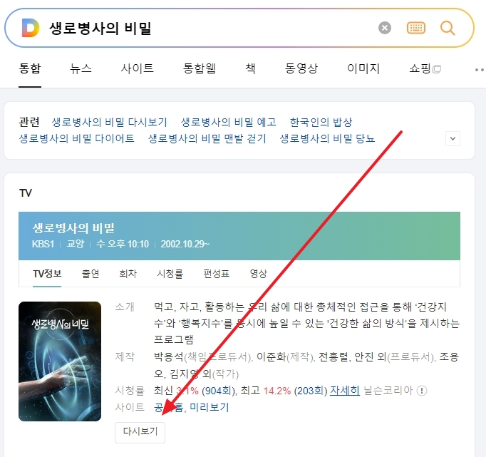 생로병사의 비밀을 온라인 검색엔진에서 찾으면 관련 프로그램 정보가 나오며, 페이지 하단에 있는 다시보기 버튼을 클릭하여 과거 방송을 다시 볼 수 있는 서비스를 이용할 수 있습니다.