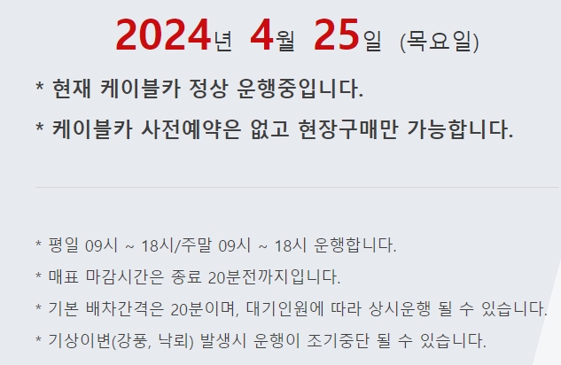 해당 페이지에는 오늘의 날짜와 함께 현재 케이블카 운행여부에 관해서 알려줍니다. 케이블카는 사전 예약 없이 현장 구매만 가능하며, 평일과 주말 모두 오전 9시부터 오후 6시까지 운행합니다. 매표 마감 시간은 운행 종료 20분 전입니다. 기본 배차 간격은 20분이며, 대기 인원에 따라 상시 운행될 수 있습니다. 기상 이변이 발생할 경우 운행이 조기 중단될 수 있습니다.