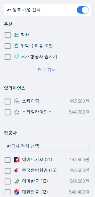 5. 세부 필터를 이용해 조건을 조정할 수 있었습니다. 예를 들어, 직항 항공편만 선택하거나 위탁 수하물 포함 여부, 저가 항공사 숨기기 등 조건을 적용하여 원하는 항공권을 쉽게 찾을 수 있습니다. 또한 스카이팀이나 스타얼라이언스 같은 얼라이언스를 선택할 수도 있습니다.