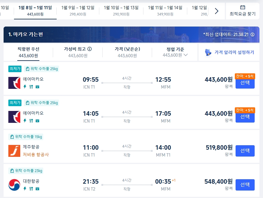4. 검색 결과, 에어마카오 항공편이 최저가로 왕복 443,600원에 제공되었습니다. 해당 항공편은 09:55와 14:05 출발 일정이 있으며, 직항으로 약 4시간 소요됩니다. 이외에도 제주항공과 대한항공 같은 다른 항공사도 옵션으로 나열되었습니다.