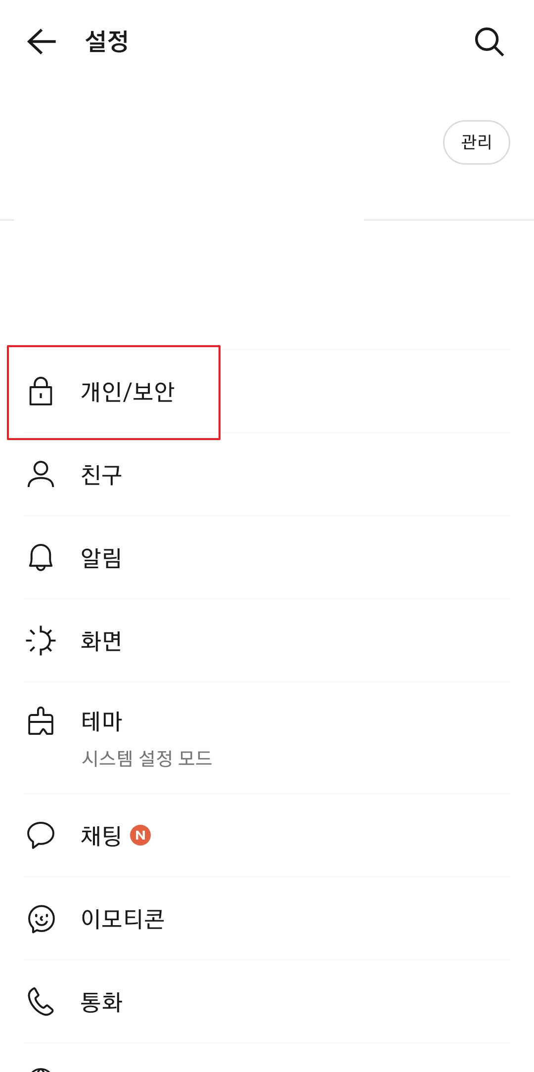 3. 설정 화면에서 개인/보안 메뉴를 선택했습니다. 이 메뉴는 개인 정보 관리와 보안 관련 설정을 변경할 수 있는 기능을 제공합니다.