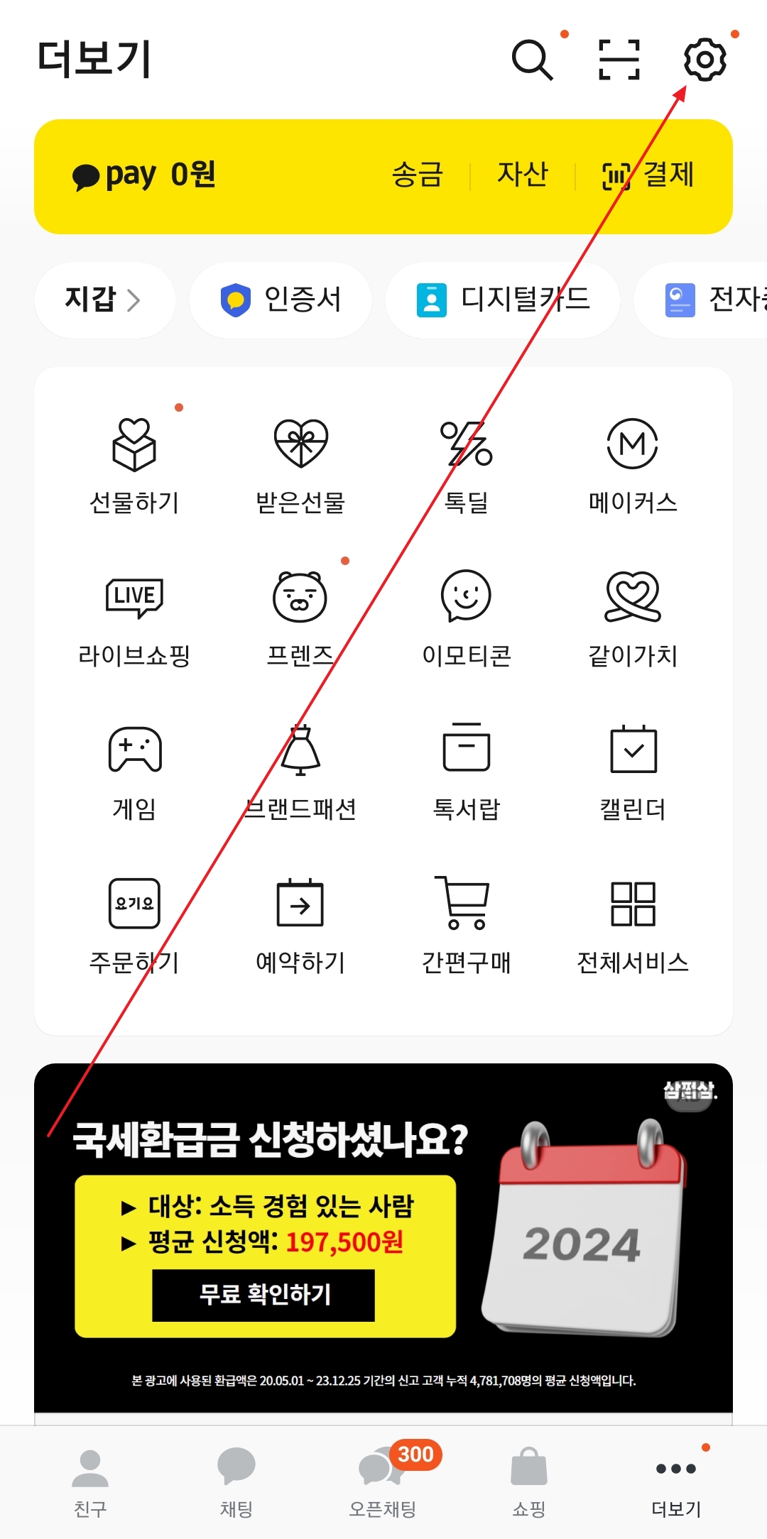 2. 더보기 화면으로 이동한 후, 오른쪽 상단에 위치한 톱니바퀴 모양의 설정 아이콘을 클릭했습니다. 이 설정 메뉴는 앱 내에서 개인화와 보안 관련 설정을 관리할 수 있는 곳입니다.