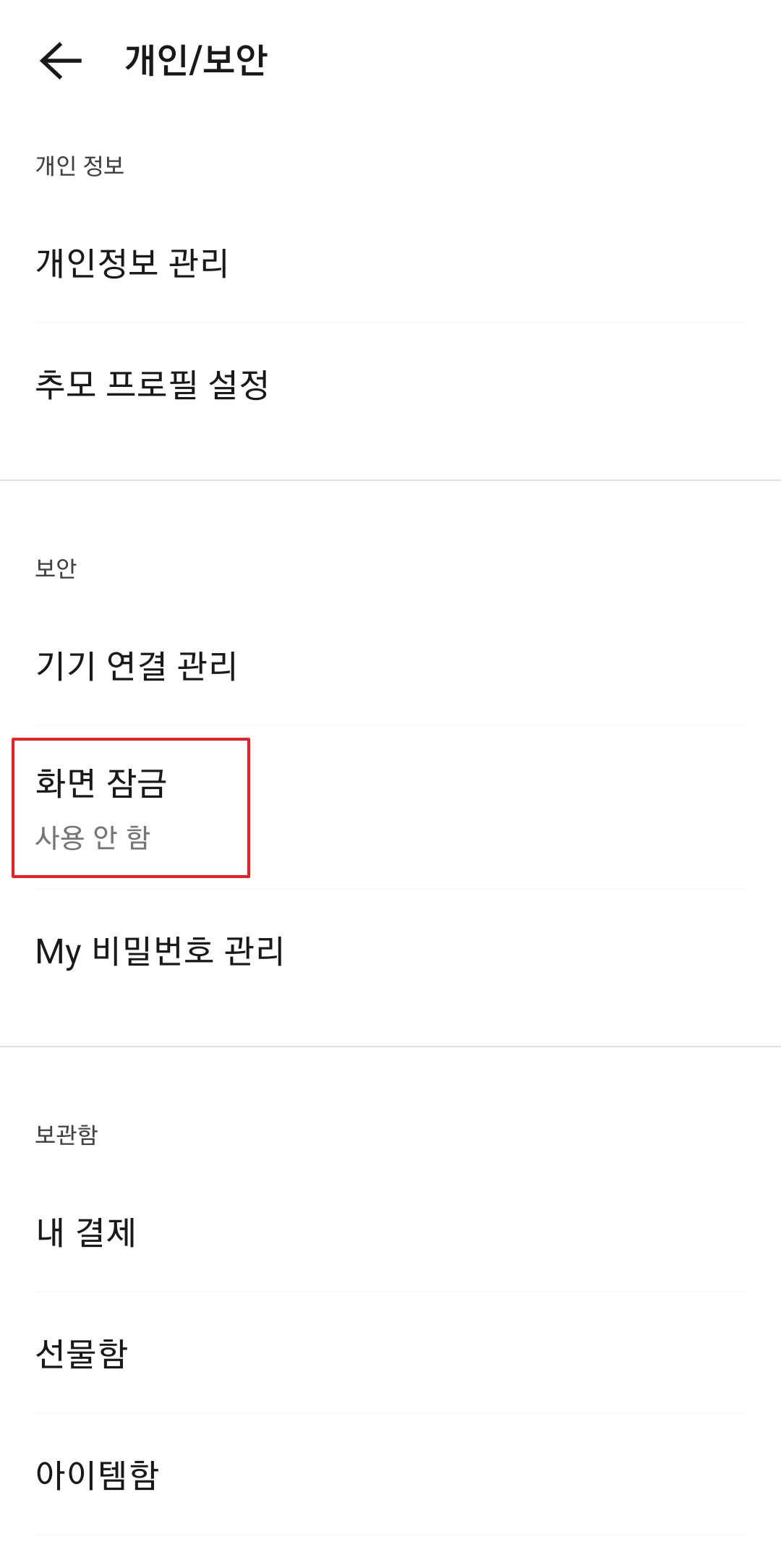 4. 개인/보안 메뉴에 진입한 뒤, 화면 잠금 항목을 클릭했습니다. 화면 잠금은 앱 사용 시 보안을 강화하기 위한 기능으로, 비밀번호나 패턴을 설정할 수 있습니다.