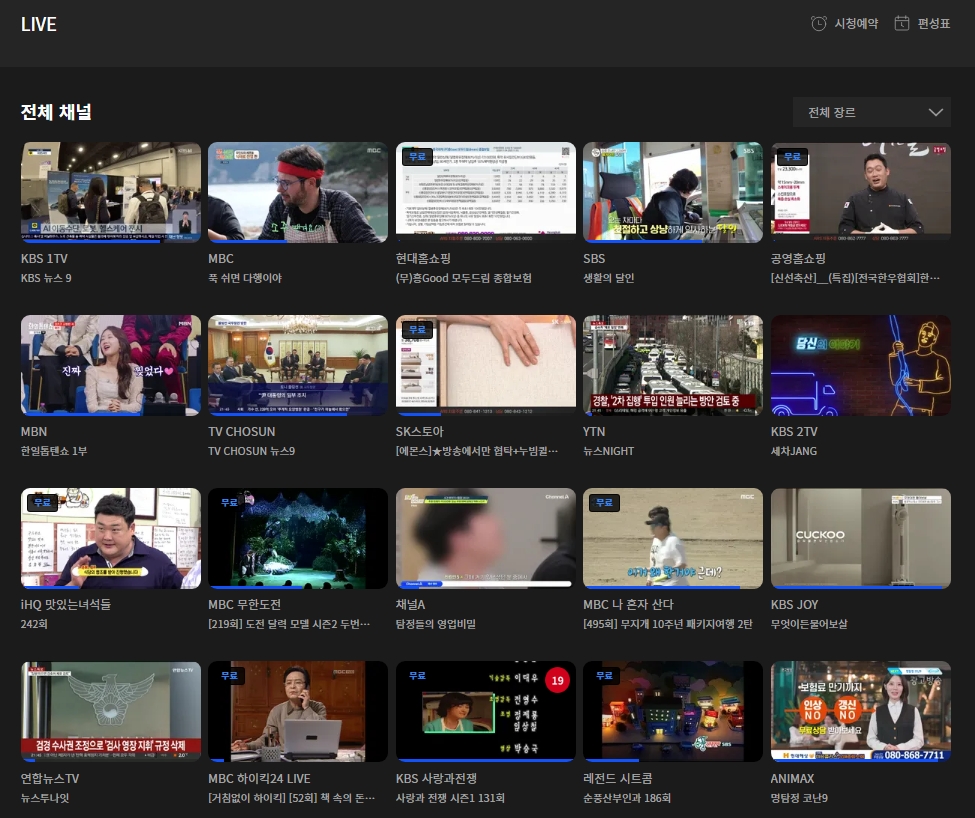 6. LIVE 섹션에서는 실시간으로 방송 중인 국내 TV 채널을 스트리밍할 수 있습니다. KBS, MBC, SBS, TV조선, YTN 등 주요 방송사들의 실시간 방송을 확인할 수 있으며, 뉴스, 예능, 드라마 등 다양한 장르의 프로그램이 포함되어 있어 실시간 시청을 원하는 사용자들에게 유용한 기능입니다.