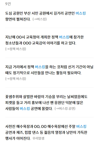 4. 예문으로는 도심 공원인 부산 시민 공원에서 길거리 공연인 버스킹 향연이 펼쳐진다가 있습니다. 이는 특정 장소에서 다양한 예술가들이 자유롭게 공연하며 관객들을 즐겁게 하는 모습을 묘사한 문장입니다.