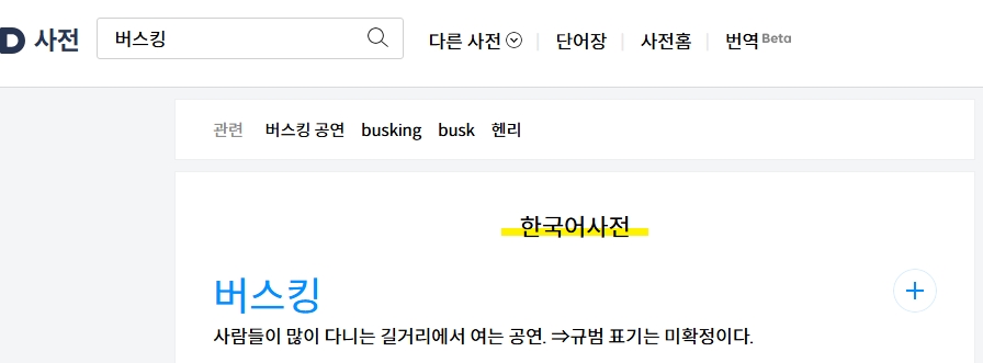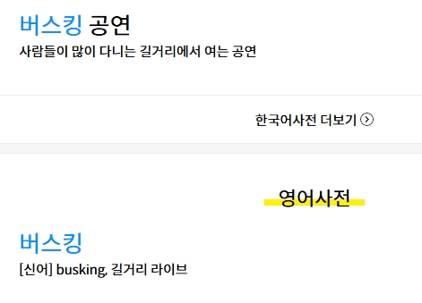 2. 검색창에 버스킹을 입력하고 검색 버튼을 클릭합니다. 검색 결과로 버스킹에 대한 정의와 관련 정보를 확인할 수 있습니다.