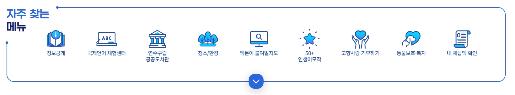 8. 메인 화면에서는 자주 찾는 메뉴로 정보공개, 국제언어 체험센터, 연수구립 공공도서관, 청소/환경 정보 등을 한눈에 볼 수 있는 바로가기 메뉴가 마련되어 있어 사용자가 원하는 정보를 쉽게 찾을 수 있습니다.