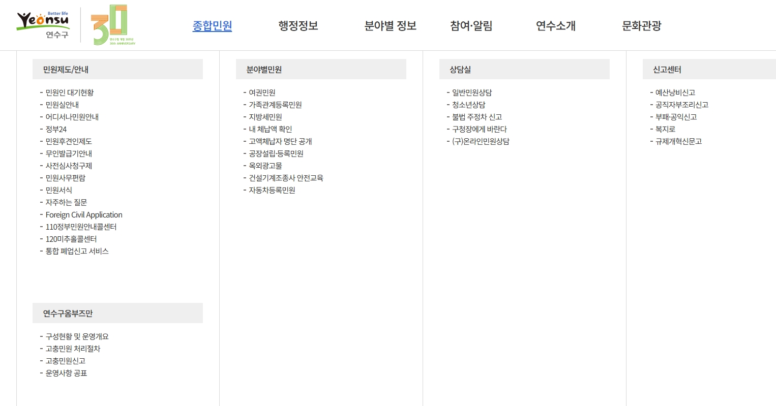 연수구청 홈페이지는 인천광역시 연수구와 관련된 다양한 정보를 제공하는 공식 창구입니다. 주민들을 위한 행정 서비스, 공지사항, 행사 일정, 민원 처리 등 생활에 필요한 정보를 쉽게 확인할 수 있습니다. 특히 구정 소식과 주민 편의를 위한 온라인 민원 서비스가 잘 갖추어져 있어, 지역 주민들에게 유용한 도구로 활용됩니다.