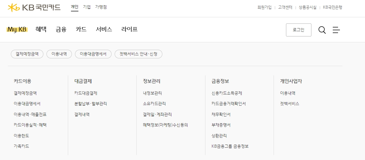 상단의 my kb 메뉴 안에는 결제예정금액과 이용내역 조회, 이용대금명세서 확인 등의 금융정보는 물론, 겟백서비스 안내와 신청까지 다양한 카드 이용 관련 서비스를 상세하게 제공하고 있어요.