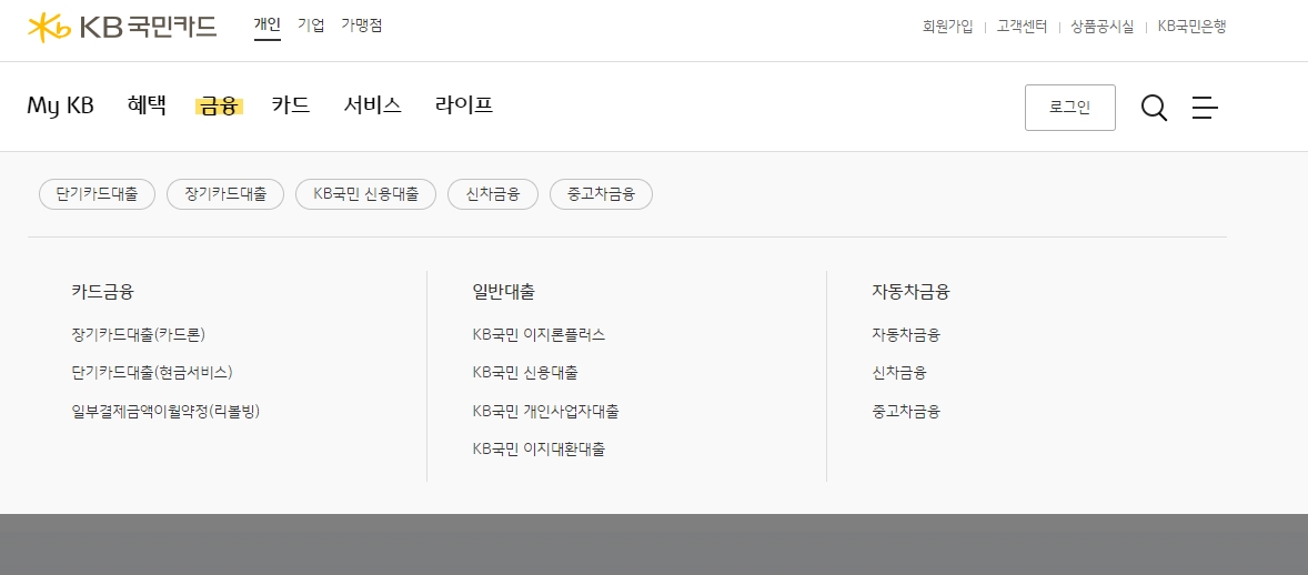 금융 서비스 메뉴에서는 자동차 관련 금융부터 신차, 중고차 구매, 개인사업자 대상 서비스, 이자 계산 및 일부 결제 서비스에 대한 정보를 제공하고 있습니다. 다양한 금융 상품에 대한 안내를 통해 필요한 서비스를 쉽게 찾을 수 있겠죠.
