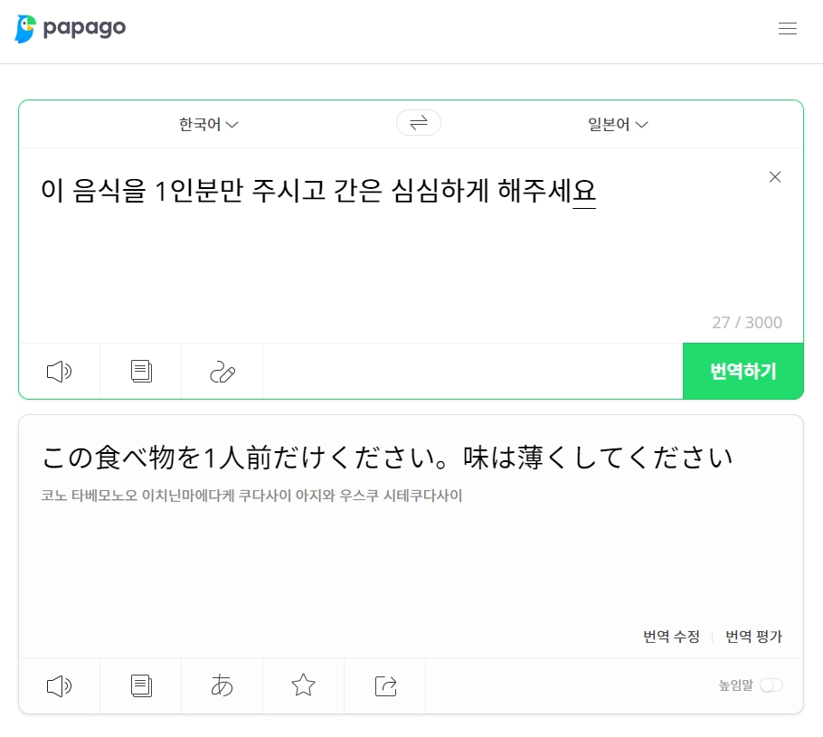 복잡한 표현을 사용할 때는 번역이 정확히 되었는지 확인하기 어려울 수 있습니다. 예를 들어 이 음식을 1인분만 주시고 간은 심심하게 해주세요와 같은 문장은 일본어로 어떻게 번역될지 예측하기 어려울 수 있습니다.