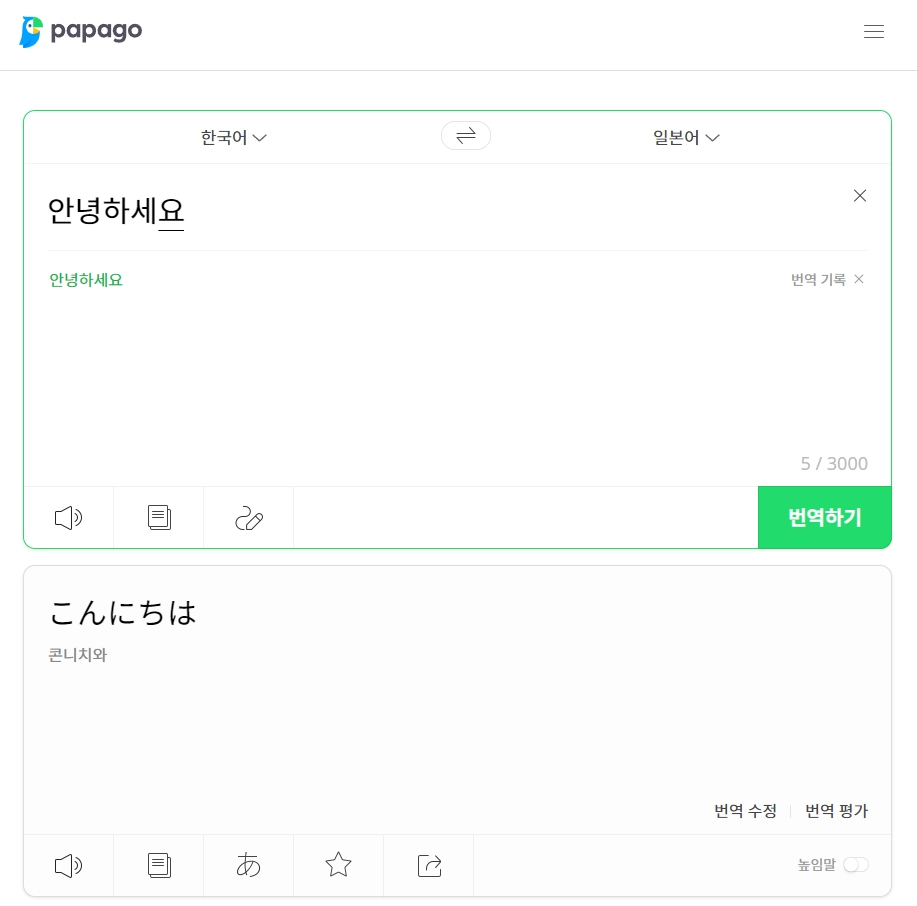 예를 들어, 안녕하세요를 번역해보면 일본어로 こんにちは(콘니치와)라고 나옵니다. 파파고는 한국어로 적어 놓은 발음도 함께 제공해 주기 때문에 발음 연습이나 실제 대화에서 말하기에도 편리합니다.