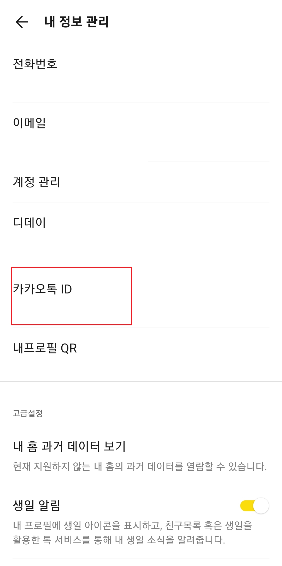 설정창으로 들어오면 최상단에 프로필사진과 함께 관리 버튼이 보이는데 여기서 관리 버튼을 클릭하면 내 정보 관리창으로 이동합니다. 내 정보 관리창에는 카카오톡 ID라는 메뉴가 보이는데 내가 미리 설정해두었다면 설정된 카톡 아이디 확인이 가능하며 미설정 상태라면 설정이 가능합니다.