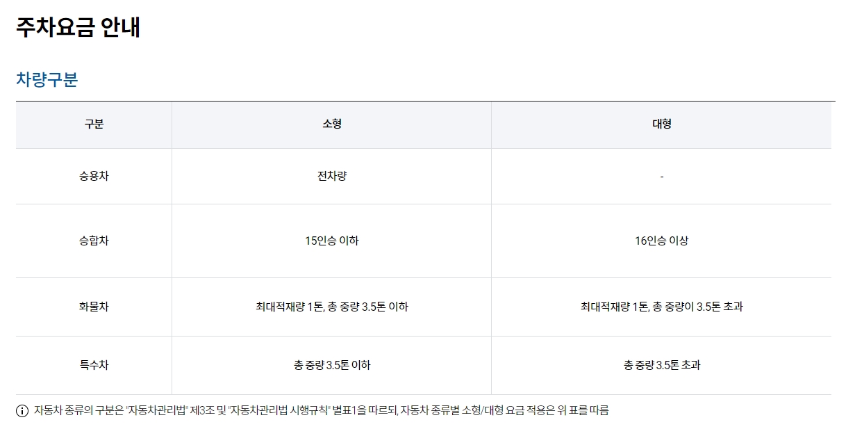 주차 요금은 차량 종류에 따라 다르며, 차량구분 안내 표에 따라 소형과 대형으로 나뉘어 요금이 적용됩니다. 승용차, 승합차, 화물차, 특수차에 따라 적재량과 총 중량을 기준으로 요금이 결정됩니다.