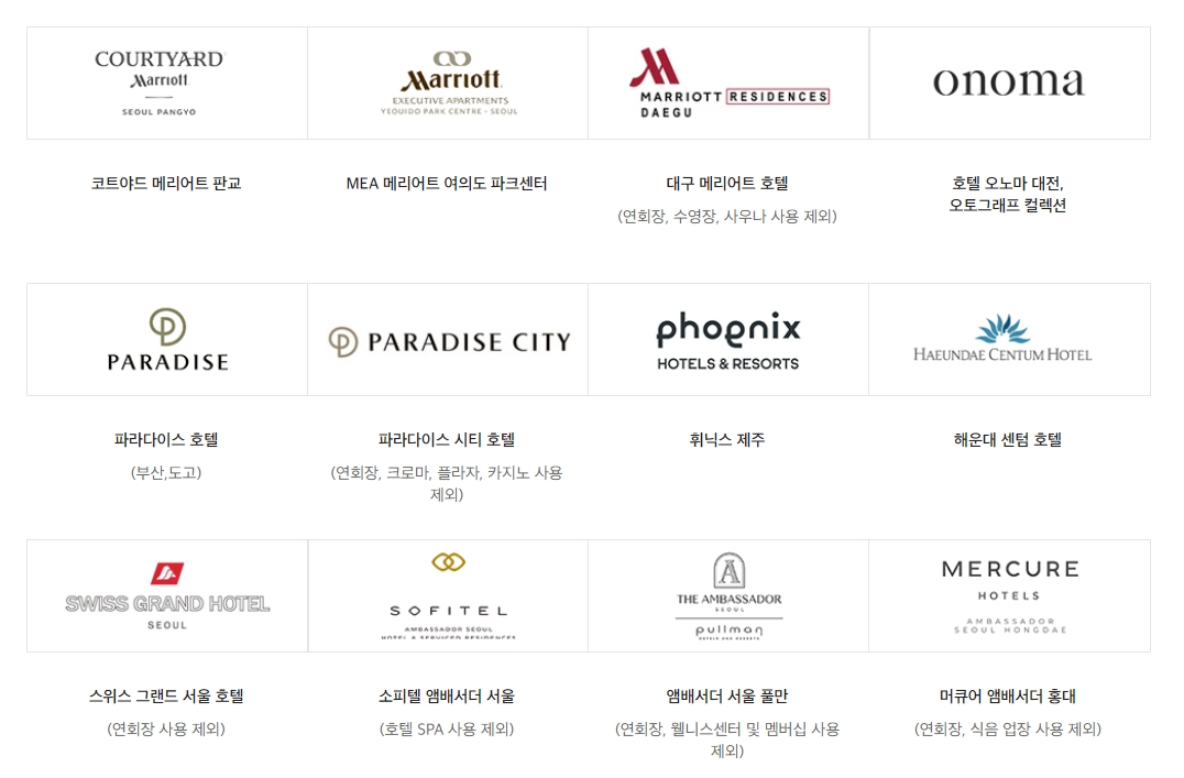 호텔 부분에서는 JW 메리어트 제주 리조트&스파, JW 메리어트 호텔 서울, 웨스틴 조선(서울, 부산), 그랜드 조선(부산, 제주), 조선팰리스 서울 강남, 럭셔리 컬렉션 호텔, 그래비티 서울 판교, 오토그래프 컬렉션, 레스케이프, 포포인츠 바이 쉐라톤 조선(서울역, 서울 명동), 신세계 영랑호 리조트, JW 메리어트 동대문 스퀘어 서울, 코트야드 메리어트 타임스퀘어, 코트야드 메리어트 판교, MEA 메리어트 여의도 파크센터, 대구 메리어트 호텔(연회장, 수영장, 사우나 사용 제외), 호텔 오노마 대전, 오토그래프 컬렉션, 파라다이스 호텔(부산, 도고), 파라다이스 시티 호텔(연회장, 크로마, 플라자, 카지노 사용 제외), 휘닉스 제주, 해운대 센텀 호텔, 스위스 그랜드 서울 호텔(연회장 사용 제외), 소피텔 앰배서더 서울(호텔 SPA 사용 제외), 앰배서더 서울 풀만(연회장, 웰니스센터 및 멤버십 사용 제외), 머큐어 앰배서더 홍대(연회장, 식음 업장 사용 제외), 원덤그랜드부산(룸서비스, 연회장, 웰니스 사용 제외)에서 사용할 수 있습니다.