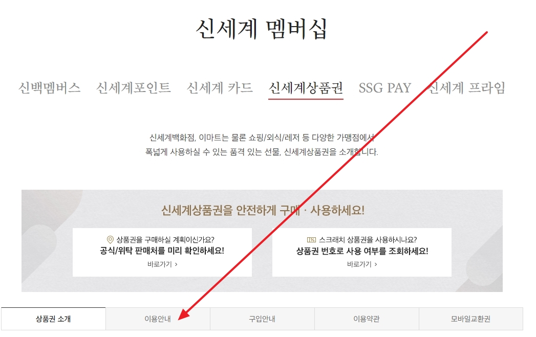 홈페이지 메인 화면 상단 메뉴에서 고객서비스 - 신세계멤버십 - 신세계상품권을 클릭해서 들어갑니다. 페이지가 이동하면 이용안내를 클릭합니다.