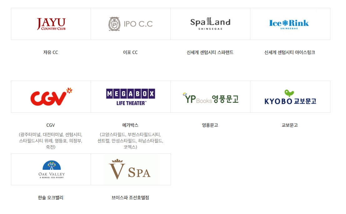 레저/문화 부분에서는 자유 CC, 이포 CC, 신세계 센텀시티 스파랜드, 신세계 센텀시티 아이스링크, CGV(광주터미널, 대전터미널, 센텀시티, 스타필드시티 위례, 영등포, 의정부, 죽전), 메가박스(고양스타필드, 부천스타필드시티, 센트럴, 안성스타필드, 하남스타필드, 코엑스), 영풍문고, 교보문고, 한솔 오크밸리, 브이스파 조선호텔점에서 사용할 수 있습니다.