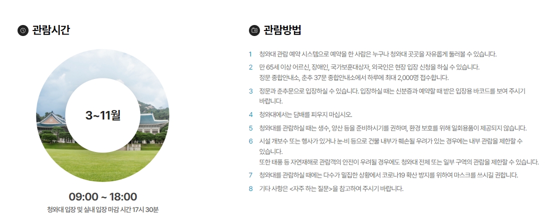 관람시간은 3월부터 11월까지는 09:00 ~ 18:00이며, 청와대 입장 및 실내 입장 마감 시간은 17시 30분입니다. 관람 방법은 청와대 관람 예약 시스템으로 예약을 한 사람은 누구나 청와대 곳곳을 자유롭게 둘러볼 수 있습니다. 만 65세 이상 어르신, 장애인, 국가보훈대상자, 외국인은 현장 입장 신청을 할 수 있습니다. 정문 종합안내소와 춘추 37문 종합안내소에서 하루에 최대 2,000명을 접수합니다. 정문과 춘추문으로 입장할 수 있으며, 입장할 때는 신분증과 예약할 때 받은 입장용 바코드를 보여 주셔야 합니다. 청와대에서는 담배를 피울 수 없으며, 관람할 때 생수, 양산 등을 준비하시기를 권합니다. 환경 보호를 위해 일회용품은 제공되지 않습니다. 시설 개보수 또는 행사, 눈·비 등으로 건물 내부가 훼손될 우려가 있는 경우 내부 관람을 제한할 수 있으며, 태풍 등 자연재해로 관람객의 안전이 우려될 경우에도 청와대 전체 또는 일부 구역의 관람이 제한될 수 있습니다. 관람할 때 다수가 밀집한 상황에서 코로나19 확산 방지를 위해 마스크를 착용하시길 권합니다. 기타 사항은 <자주 하는 질문>을 참고하시기 바랍니다.