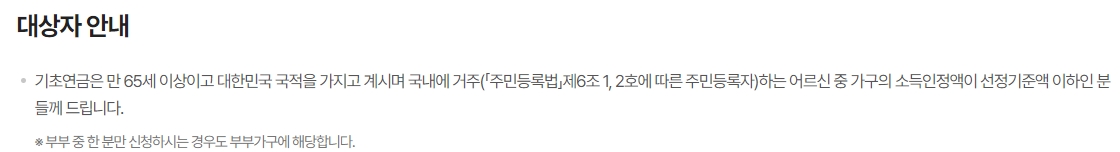 3. 기초연금 수급 대상은 만 65세 이상, 대한민국 국적을 가지고 국내에 거주하는 어르신 중 소득인정액이 기준 이하일 경우 해당됩니다. 참고로 부부 중 한 분만 신청해도 ‘부부가구’로 분류되니 이 점도 꼭 유의하셔야 해요.