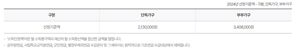 6. 다만, 직역연금 재직기간이 10년 미만인 경우에는 연계형 퇴직연금이나 유족연금 수급권자가 되면 기초연금 신청이 가능할 수도 있습니다. 이 경우에도 꼭 소득인정액 기준을 충족해야 하니 이 부분 꼼꼼히 따져보셔야 해요.