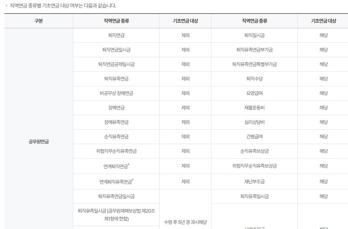 5. 직역연금별로 기초연금 대상이 되는지 여부는 표로 제공되고 있으니, 복잡하게 따지지 말고 본인 상황에 맞춰 표만 비교해보셔도 빠르게 이해됩니다. 연금 종류마다 조건이 조금씩 다르거든요.