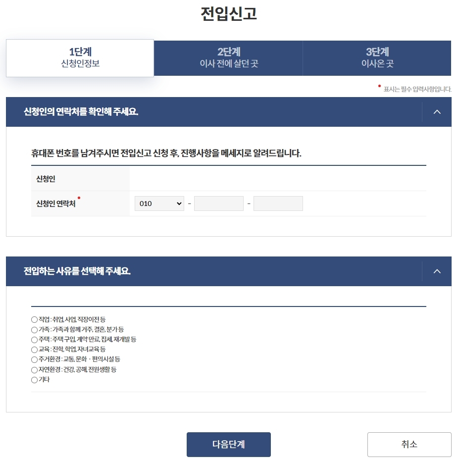 9. 개인정보를 입력한 뒤에는 이사 사유를 선택하는 단계가 있어요. 직장 이동, 가족 문제, 주택 문제, 교육 관련, 주거환경 변화, 자연환경 등 여러 가지 중에서 선택하실 수 있습니다. 이 부분은 간단히 체크만 하시면 돼요.