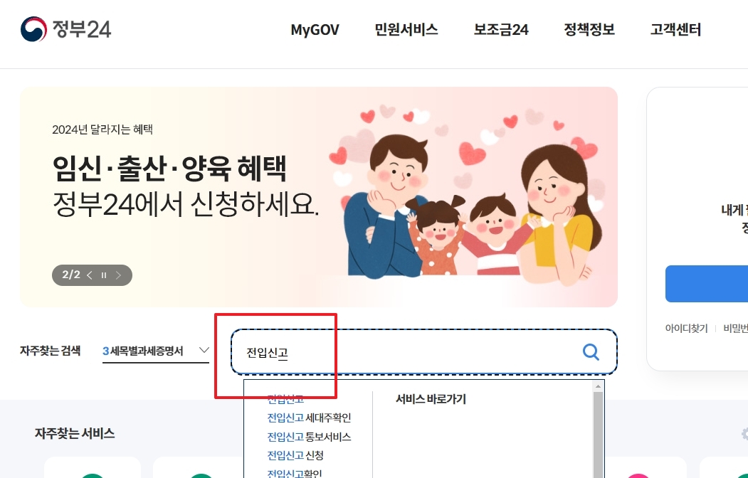 2. 검색창에 전입신고라고 입력해보세요. 홈페이지 상단 또는 메인에 있는 검색창에 간단히 입력만 해도 관련된 서비스가 주르륵 나와서, 헷갈리지 않고 원하는 항목을 바로 찾을 수 있어요. 예전처럼 이리저리 메뉴 뒤지지 않아도 돼서 훨씬 직관적이에요.