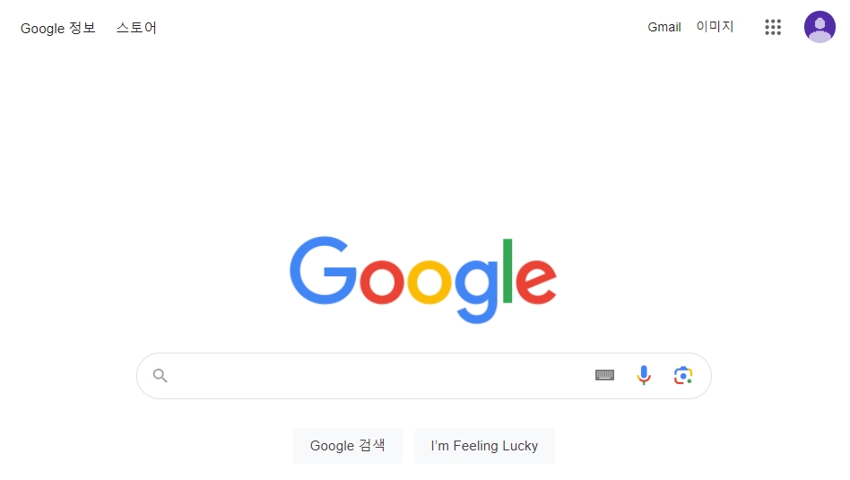 2. 화면 중앙에는 검색창이 큼직하게 배치되어 있는데요, 바로 아래에는 Google 검색과 Im Feeling Lucky 버튼이 있어요. 로그인한 상태라면 오른쪽 상단에 내 계정 아이콘도 뜨고, Gmail이나 이미지 메뉴도 쉽게 접근할 수 있도록 준비돼 있어요. 모든 기능이 너무 심플하게 구성돼 있어서 처음 이용하는 분들도 전혀 어렵지 않게 사용할 수 있습니다.