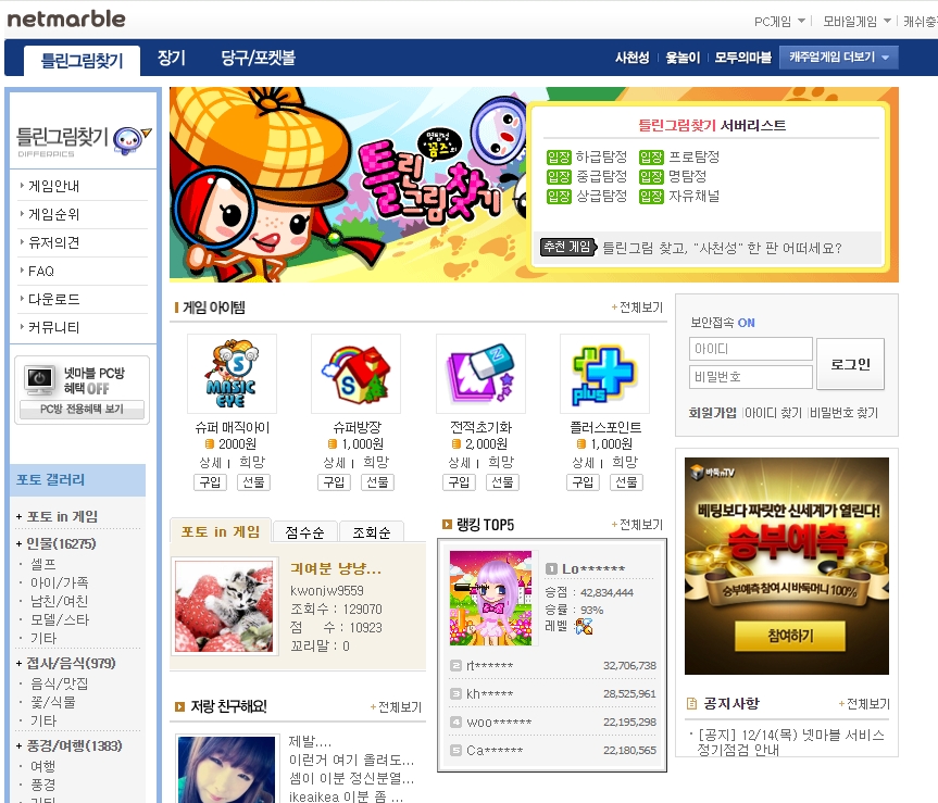 2. 메인 화면을 아래로 쭉 내리다 보면 여러 가지 게임 항목들이 나오는데요, 여기서 PC게임이라는 항목을 찾으신 다음 그 안에 있는 틀린그림찾기 게임을 클릭하면 됩니다. 게임이 워낙 다양해서 처음엔 어디 있는지 헷갈릴 수도 있지만 천천히 내려보면 금방 찾을 수 있어요.