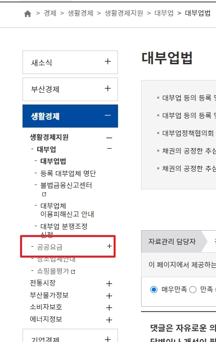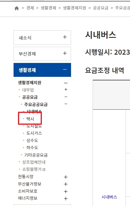생활경제 페이지로 이동하면 좌측의 메뉴에서 공공요금을 클릭하고, 하위 메뉴가 열리면 택시를 클릭합니다.