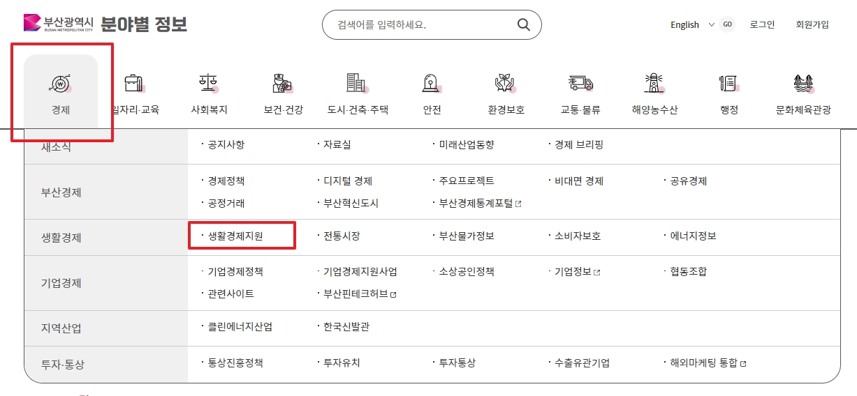 상단의 메뉴에서 분야별정보를 클릭합니다. 분야별정보 페이지로 이동하면 다시 한 번 상단 메뉴에서 경제를 찾아서 생활경제 - 생활경제지원을 클릭합니다.