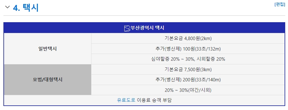 부산의 택시 기본요금은 4,800원이라고 나옵니다. 그러나 거리 요금, 시간 요금, 할증에 관한 설명이 하나도 없습니다.
