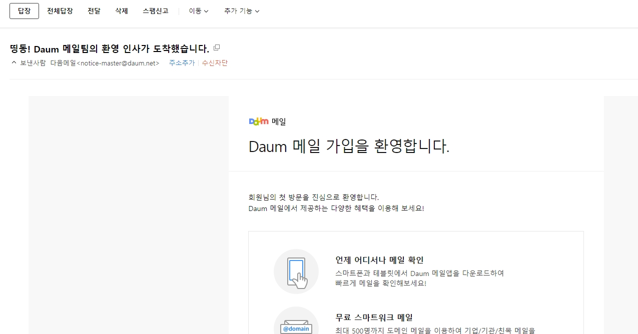 5. 메일을 열어보면 상단에 다양한 기능 버튼이 보여요. 답장 보내기, 전달하기, 삭제하기는 물론이고 스팸 신고까지 바로 가능해서 관리하기 편리하답니다. 저도 처음 가입했을 때 온 환영 메일을 이렇게 확인했었어요.