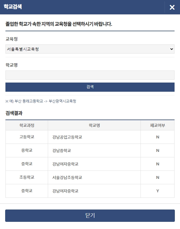 8. 마지막으로 교육청을 선택하고 학교명을 검색하면 목록이 쭉 나옵니다. 초등학교부터 고등학교까지 다 나오니까, 본인이 다닌 학교를 정확하게 선택하면 돼요. 여기까지 하면 거의 끝났다고 보시면 됩니다!