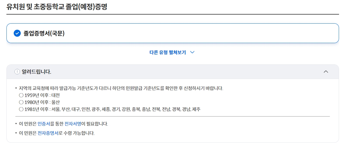 목록에 고등학교 옵션이 보이지 않을 때는 필터 옆 ‘모두 보기’를 클릭하거나 검색창에 학교 이름과 ‘졸업증명’ 키워드를 조합해 입력해 보세요. 자동 완성 기능이 고등학교 졸업증명 항목을 바로 연결해 줄 거예요.